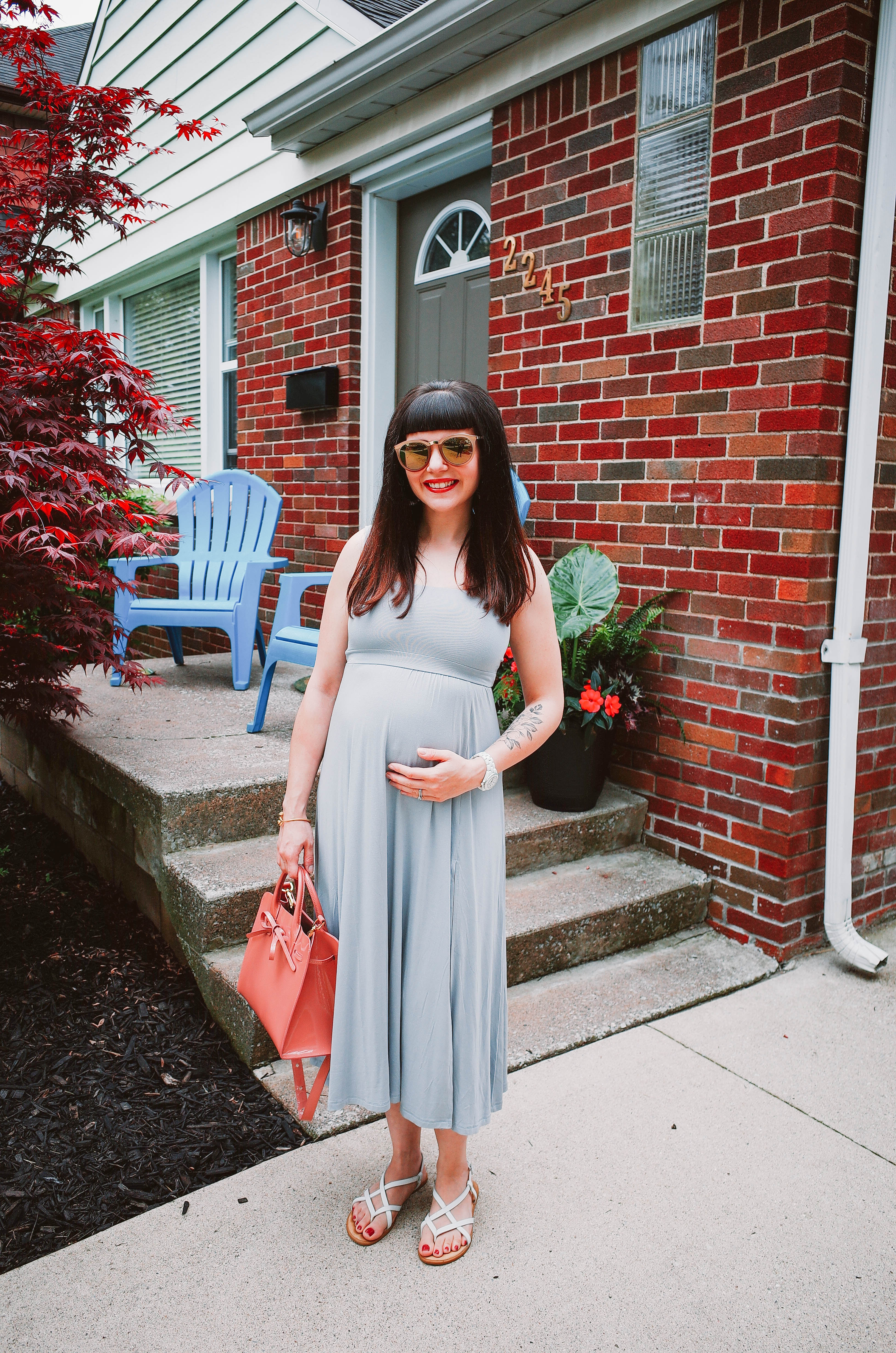 - Go midi or maxi. Though a mini dress would be cooler during the hot summer days, they don’t work as well if you have a larger bump because the skirt ends up sticking out too far and riding up. Being only 5’1″, midi dresses basically work as maxi dresses for me; they provide just the right amount of coverage. I’ve been fortunate that I can still shave my legs, but for those who have more difficultly, midi and maxi dresses also help with that!